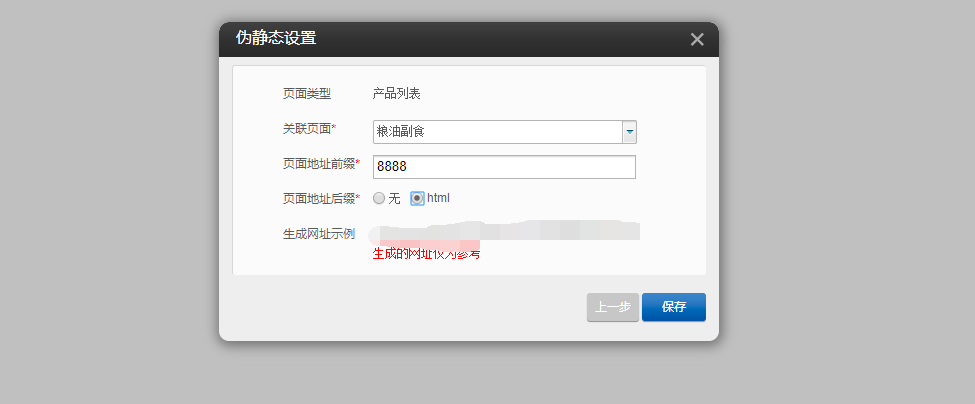 1.以PC版为例,首先在建站编辑器中点击“设置”-“伪静态”-“添加伪静态规则”,选择页面的类型“产品列表”或“文章列表”,进行伪静态的设置,设置完成后点击“保存”,然后在编辑器中拖入“文章分类”或“产品分类”,点击“设置”,将分类链接页面与在伪静态设置中的页面选择一致即可,然后点击保存,如图所示: